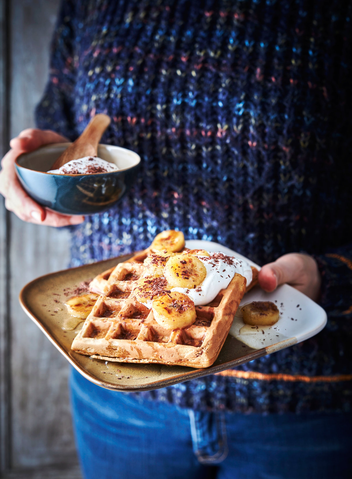 Servez les gaufres chaudes, garnies de chantilly, de bananes caramélisées et de copeaux de chocolat.