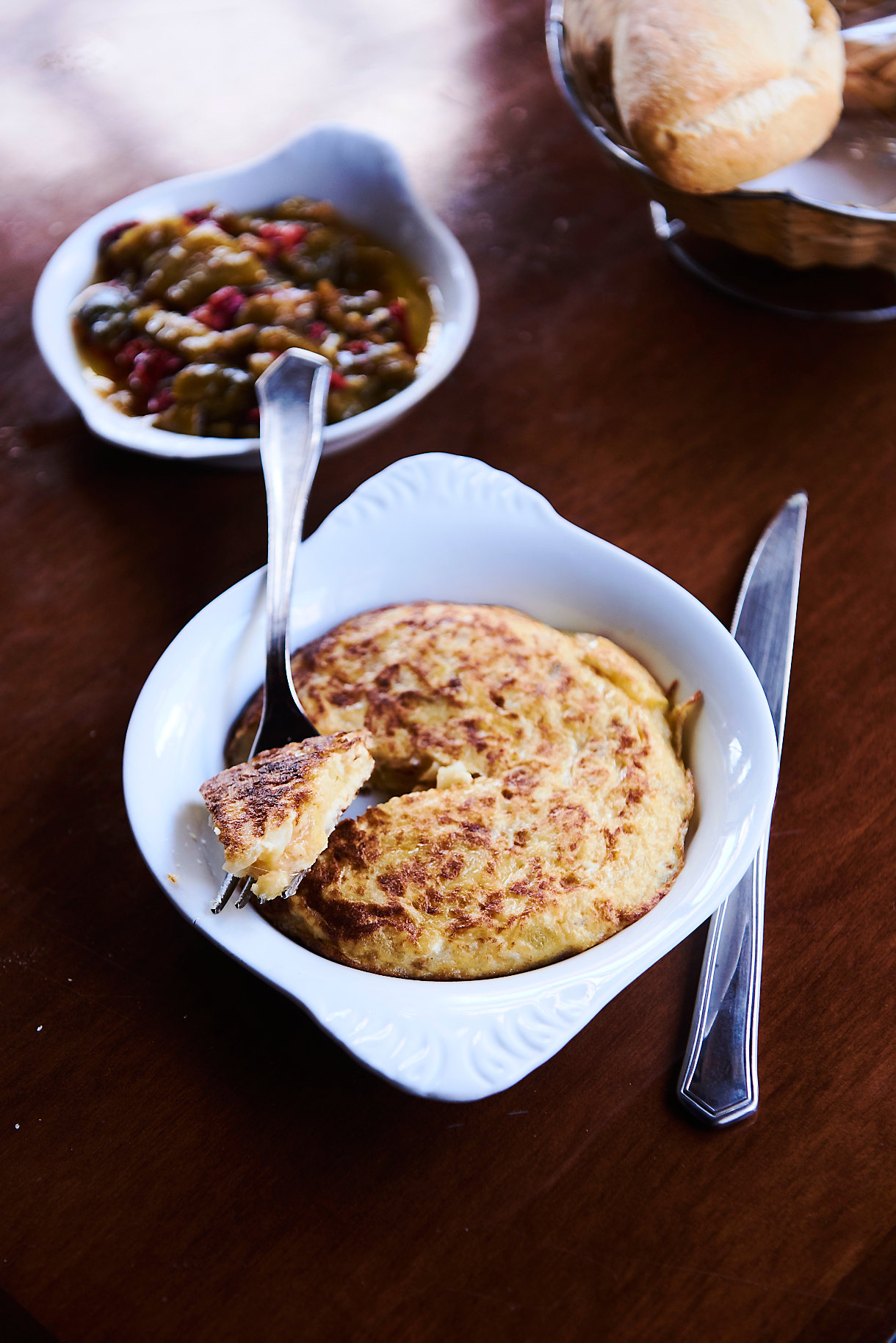 Dans un saladier, fouettez les oeufs. Salez et poivrez. Versez l’omelette sur les pommes de terre. Faites cuire sur feu vif durant 1 min, et ensuite sur feu moyen durant 2 min. Retournez l’omelette en vous aidant d’une assiette et poursuivez la cuisson encore 2 min. Elle ne doit pas être baveuse. Servez chaud ou froid avec des poivrons confits.